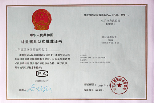 近日,德瑞克接到市局通知,在濟(jì)南市質(zhì)量技術(shù)監(jiān)督局一樓計(jì)量器具型式許可證窗口領(lǐng)取到了電子拉力試驗(yàn)機(jī)型式批準(zhǔn)證書(證書編號(hào)2014F376-37),加上之前領(lǐng)取的電子式抗壓試驗(yàn)機(jī)(證書編號(hào)2014F277-37)、電子式壓縮試驗(yàn)儀(證書編號(hào)2014F278-37)的型式批準(zhǔn)證書,至此,德瑞克涉及的國(guó)家法定監(jiān)管的計(jì)量產(chǎn)品已全部獲得證書。