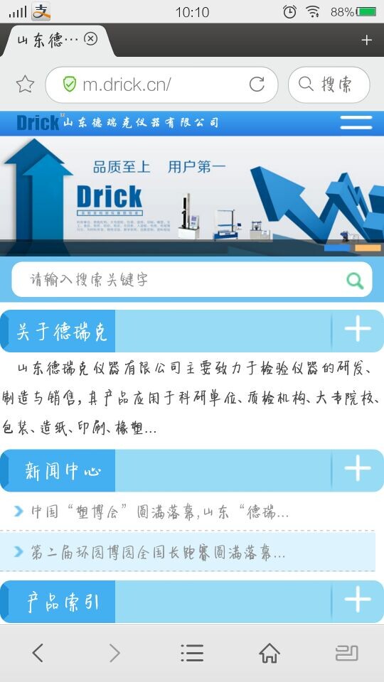 山東德瑞克作為引領(lǐng)創(chuàng)新技術(shù)的領(lǐng)導(dǎo)者,一直不斷的創(chuàng)造新技術(shù),挖掘新技能,學(xué)習(xí)新知識;“不斷創(chuàng)新”貫穿著德瑞克公司的發(fā)展歷程。我們秉承“客戶滿意是我們永無止境的追求”的服務(wù)準(zhǔn)則,為方便客戶更快速,更便捷的了解我們的產(chǎn)品,2015年新年伊始,特推出手機(jī)網(wǎng)站“m.drick.cn”“m.jndrktest.com”“m.worlddrick.com”供大家瀏覽,為全球客戶提供檢測儀器行業(yè)最新資訊,最新發(fā)展方向。